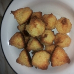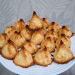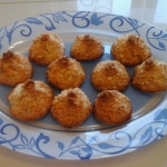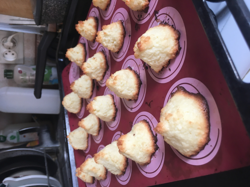 У меня было всего 120гр кокосовой стружки. Я добавила 2 яйца, 76г сахара и 1 ложек кукурузного крахмала. Получилось тесто жидким. Добавила на глаз кокосовой муки до нужной консистенции.