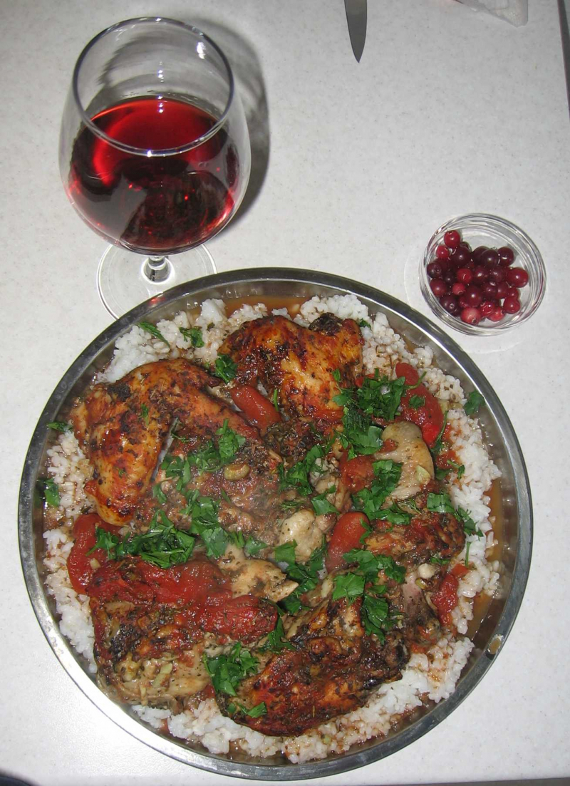 Сочная курочка)) делала без лука, т.к. не очень доверяю сырому луку при запекании (или не добавляю в маринад, или заранее обжариваю) и без маслин - я их или в конце добавляю (иначе могут горчить) или вообще без них. Муж попросил без них)). Чеснок и прованские травы, пять перцев - и все и так прекрасно и ароматно. Закрыла вначале фольгой, а потом для корочки открыла)). С рисом и красным вином муж ел и хвалил. Нямка)). Спасибо за рецепт!