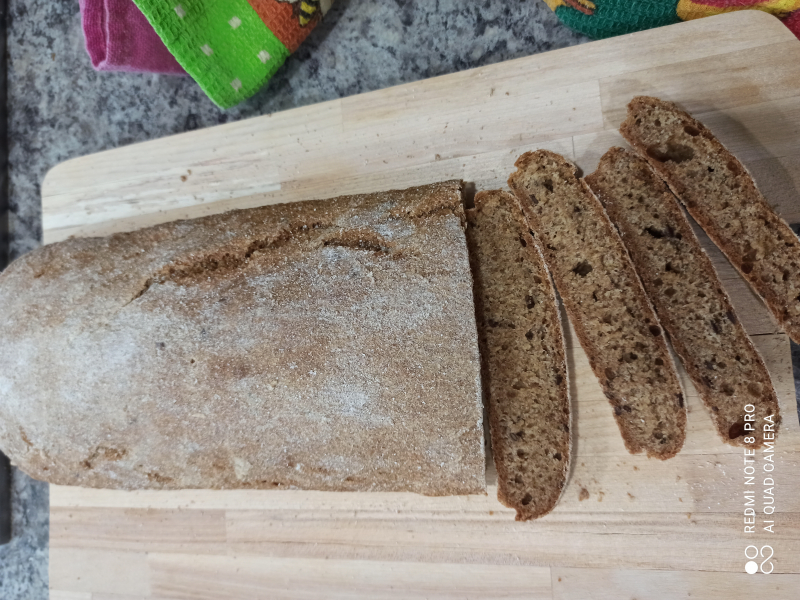 Замес теста получился с семенами льна, но без клюквы. Тесто и хлеб не поднимался, но испекся хорошо. Хочется чуть-чуть побольше соли положить. Спасибо рецепт понравился)