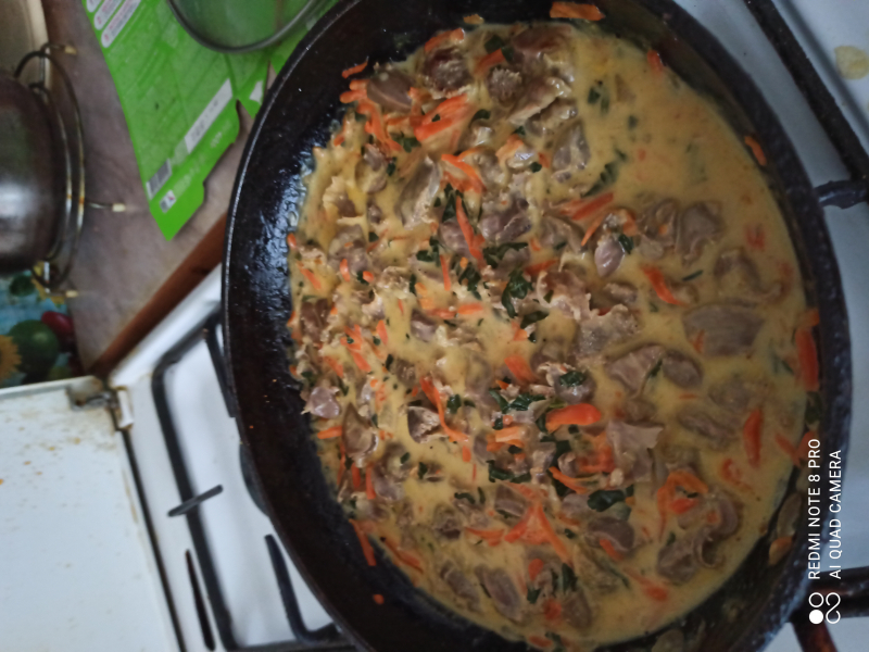Предварительно варю 1.20,затем в сковороде с пережареныи луком и морковью тушу с тобавлением бульона ещё минут сорок, в конце готовки добавляю сметану, специи, зелень, если желудки предварительно не отварить, они будут жесткие, как сырые, всё выкините на помойку