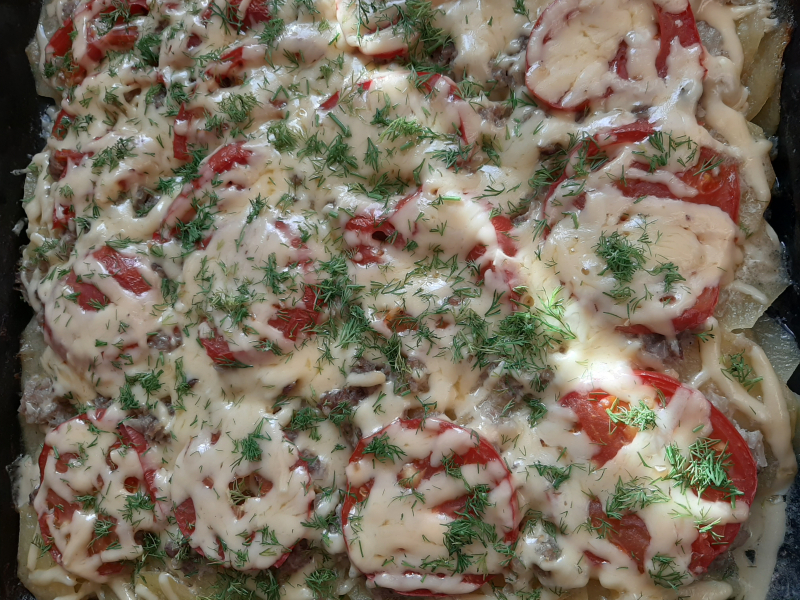 Фотоотзыв по рецепту: Картошка с фаршем и помидорами в духовке