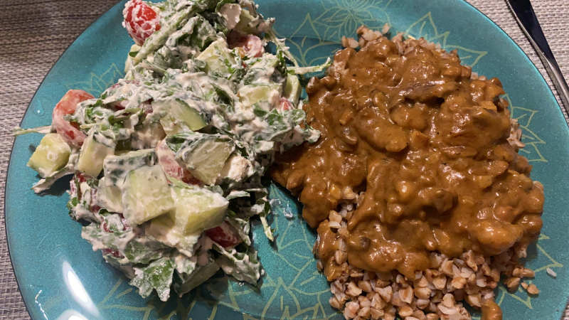 добавили ещё соевый соус и аджику абхазскую) отварили гречку и сделали салат из овощей, рукколы и сиртаки с бальзамическим уксусом)