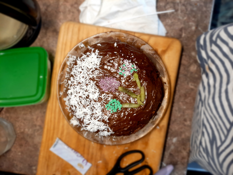 Торт получился волшебный. Делали с детьми, справились отлично.  Да, немного крошатся коржи, но не когда режешь, а когда начинаешь собирать и промазывать, но это легко поправимо))) торт получися с первого раза, все поднялось и пропеклось. Глазурь по рецепту тоже получилась. Крем сделали из сметаны со сгущёнкой.