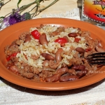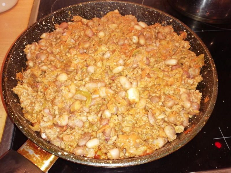 Рис не готовил. Фасоль и так - довольно сытный продукт. А, тем более, если она ещё и с мясным фаршем.
