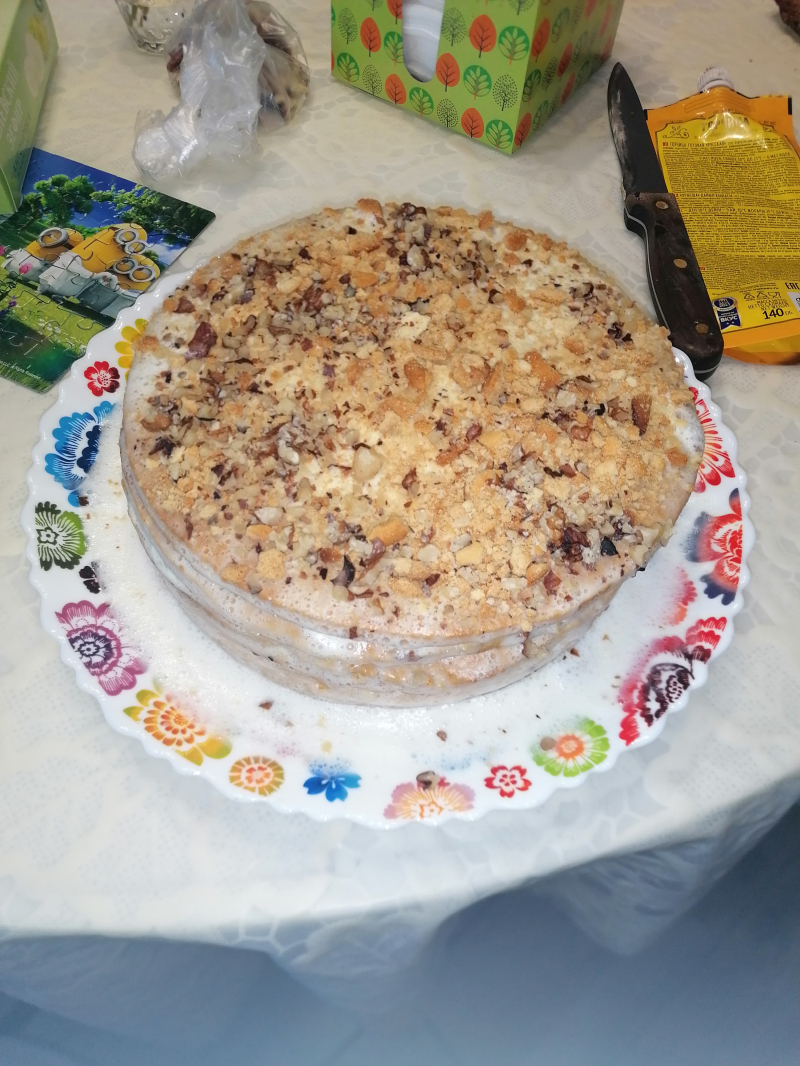 Тесто получилось идеальное, а вот с кремом беда(не было жирной деревенской сметаны, взяла обычную в магазине 25%,после взбивания она стала жидкой как ряженка, оставила на ночь в холодильнике, не застыла( намазала как есть и поливали кусочки сверху сметаной. Вкусно конечно, но не то, что хотела